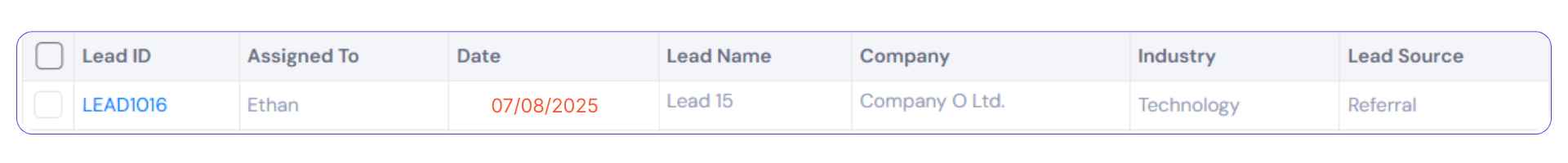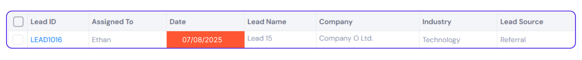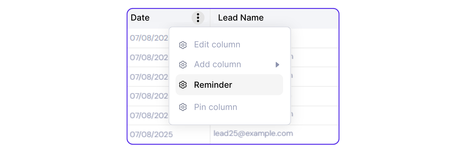 Select a module → select an object → locate a ‘Date’ or ‘Date & Time column’ → click the vertical ellipsis (⋮) icon in the column header → select ‘Reminder’.