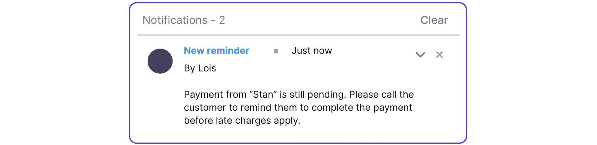 Note: The name of the user who created the notification appears on top of the notification panel in the format “By <user.name>”. In the example above, ‘Charlie’ is the user who created the notification.